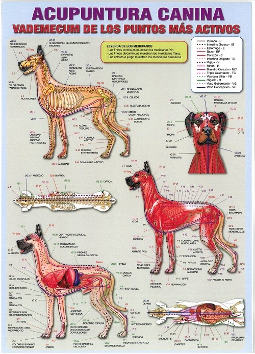 Lámina plastificada, ilustrada a todo color,a dos caras, que incluye un gráfico de los diferentes puntos más activos de acupuntura canina.