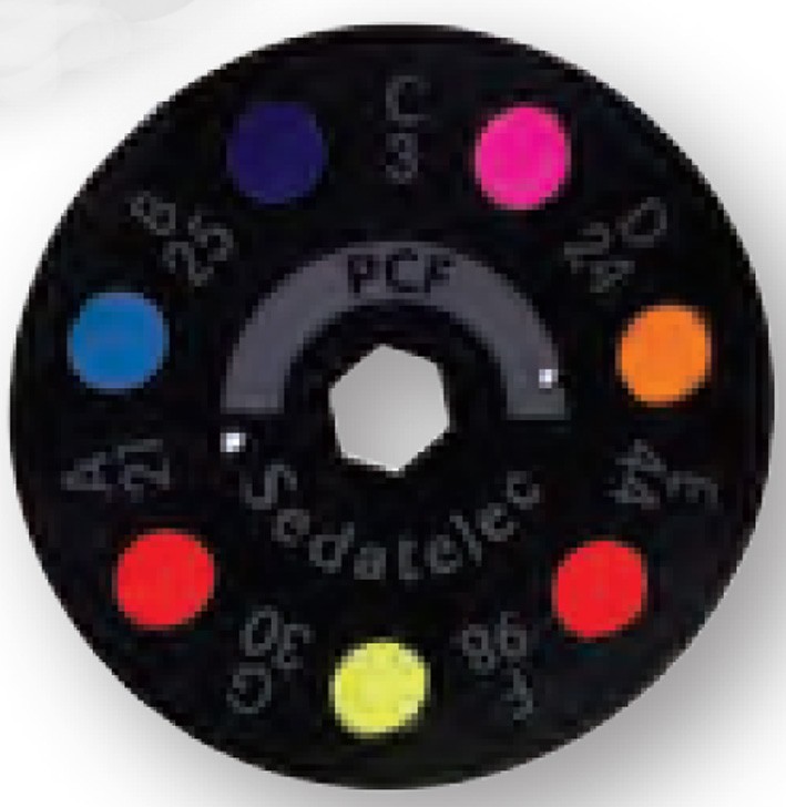 Disco PCF que contiene los siguientes colores:Naranja A21 Rojo B25 Amarillo C3 Rojo D24 Azul E44 Azul F98 Rojo G30