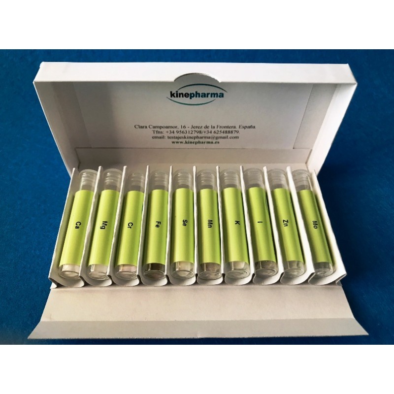 Kit de minerales, con los 10 principales minerales para el tratamiento del paciente: Calcio, Selenio, Magnesio, Hierro, Cobre, Molibdeno, Zinc, Manganeso, Iodo y Potasio.